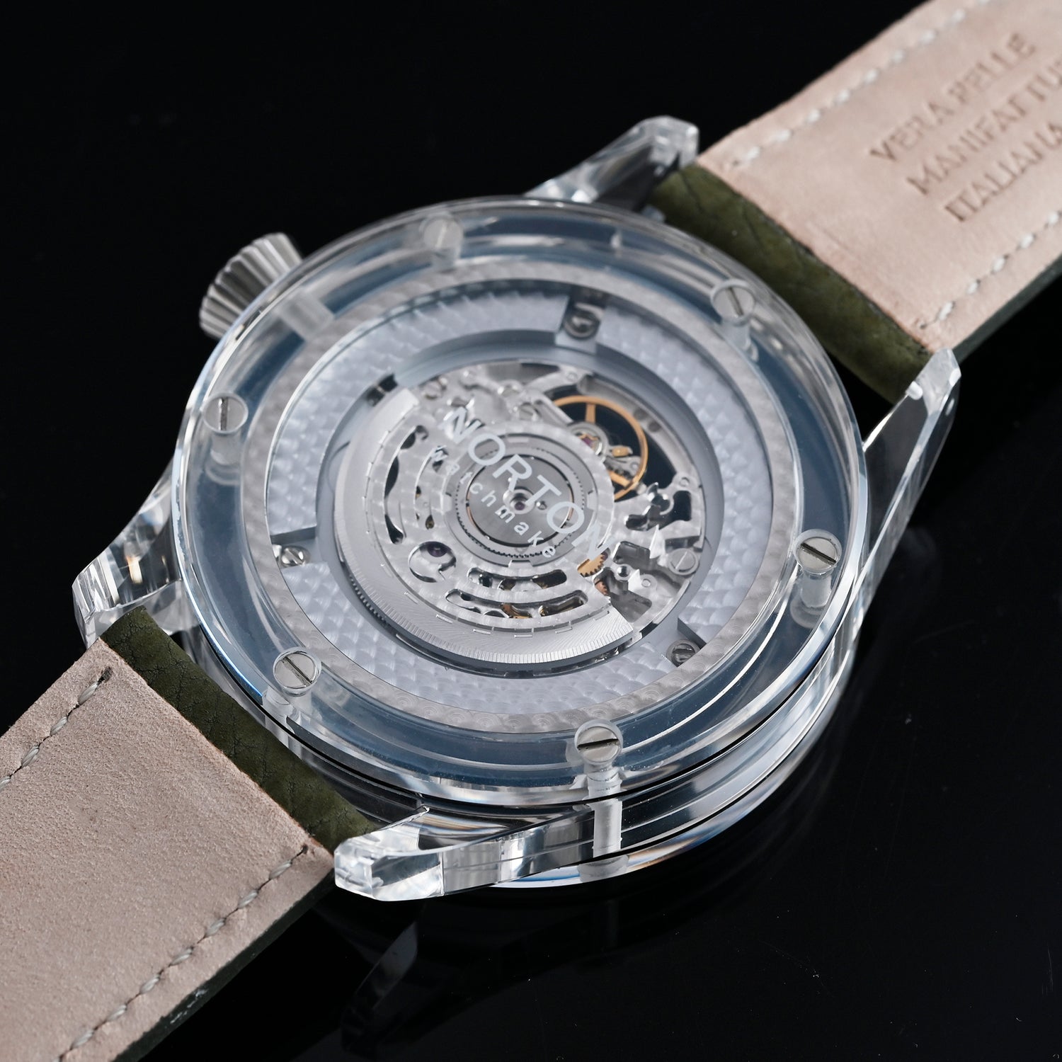Powered by the Sellita SW300-1 skeleton Swiss Made calibre, visible both on the dial and through the transparent caseback, the watch celebrates the beauty of mechanical motion and the excellence of the Swiss watchmaking tradition.