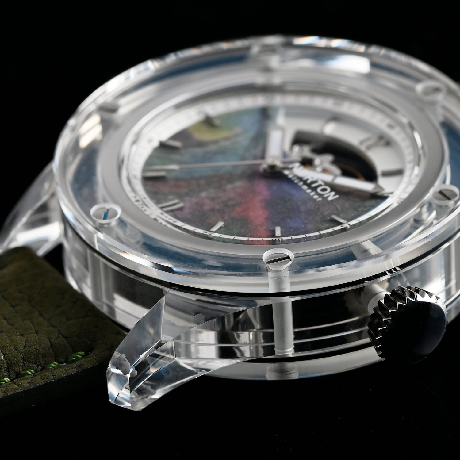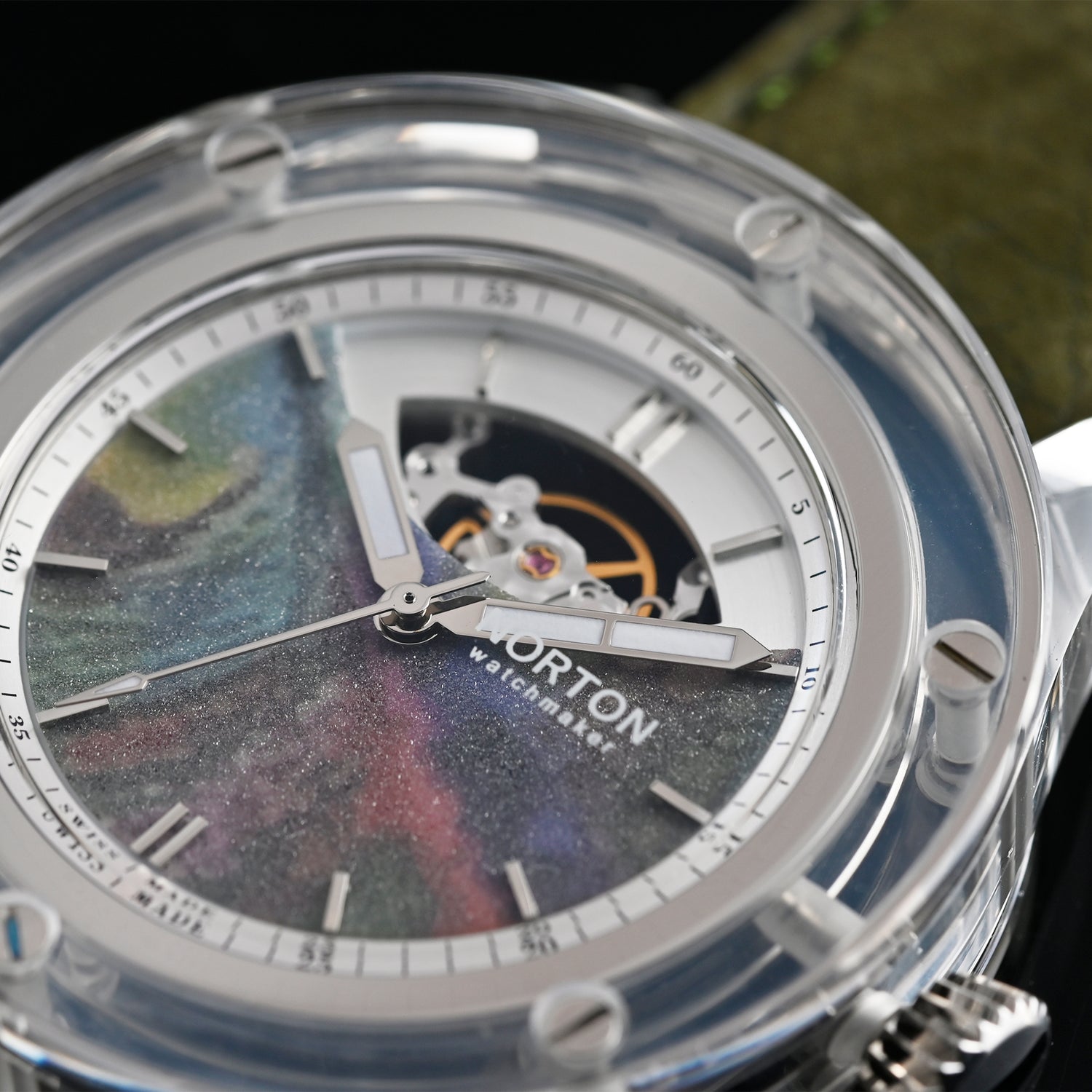 The multi-layer dial is enhanced by a composition created with DiamArt Essence, a special custom variant that integrates fine natural diamonds (0.07–0.10 mm grain size) and a multicolour pigmentation called Camaleonte. The result is a vibrant, shifting surface that captures light in a unique way, creating refined reflections and visual depth. The DiamArt technology, protected by an Italian patent, transforms the dial into a precious element where art, material, and innovation meet.