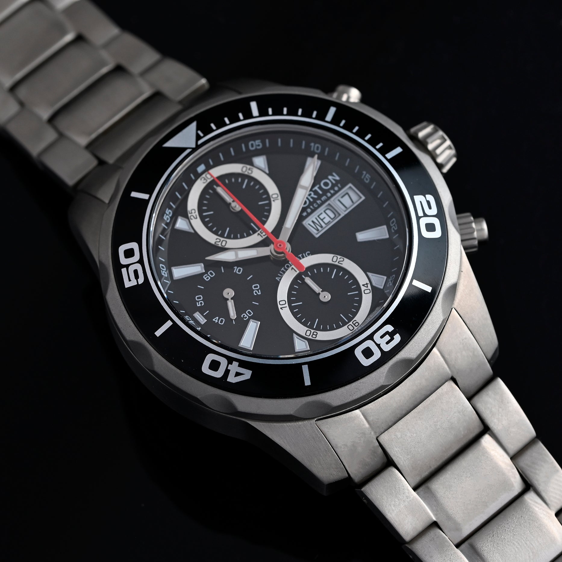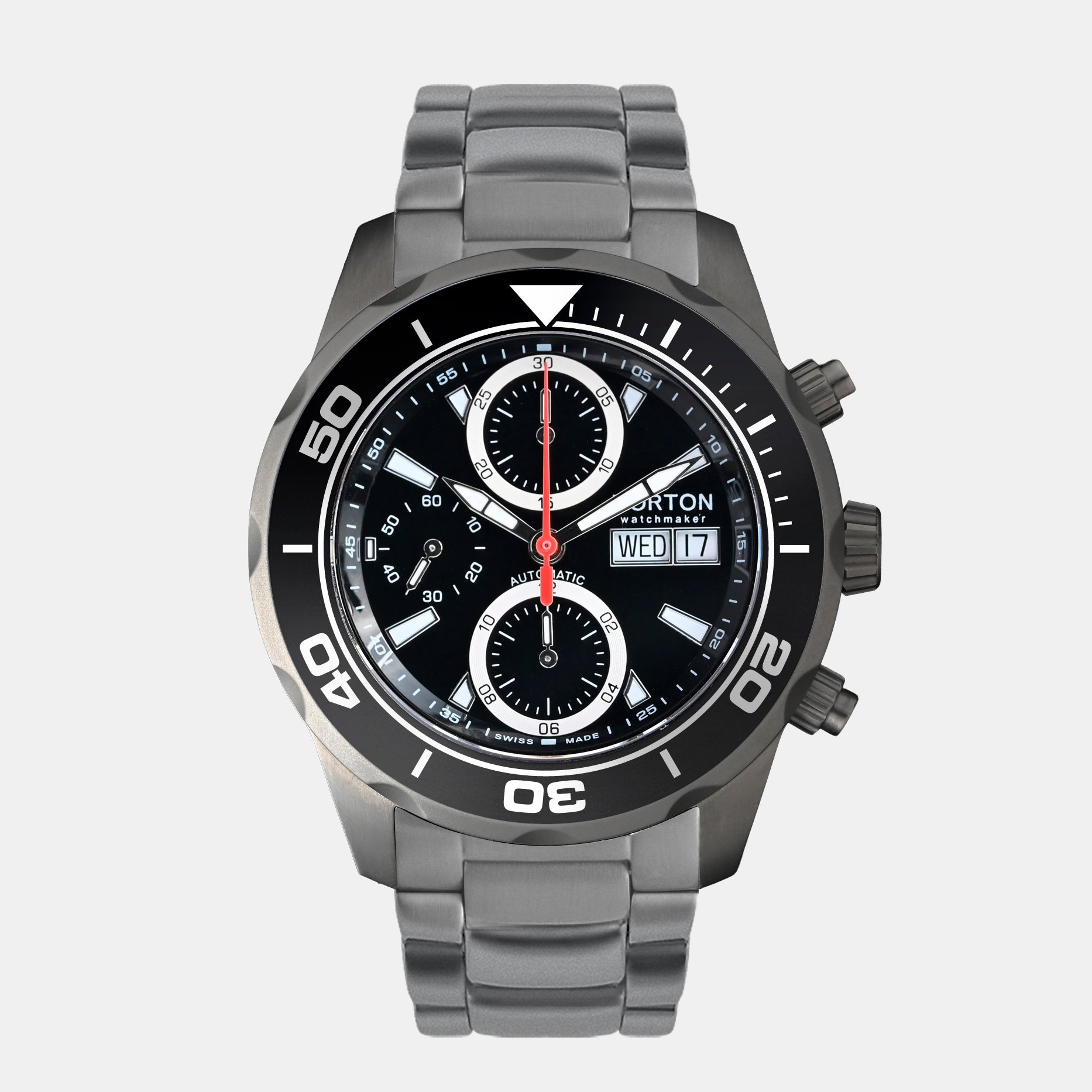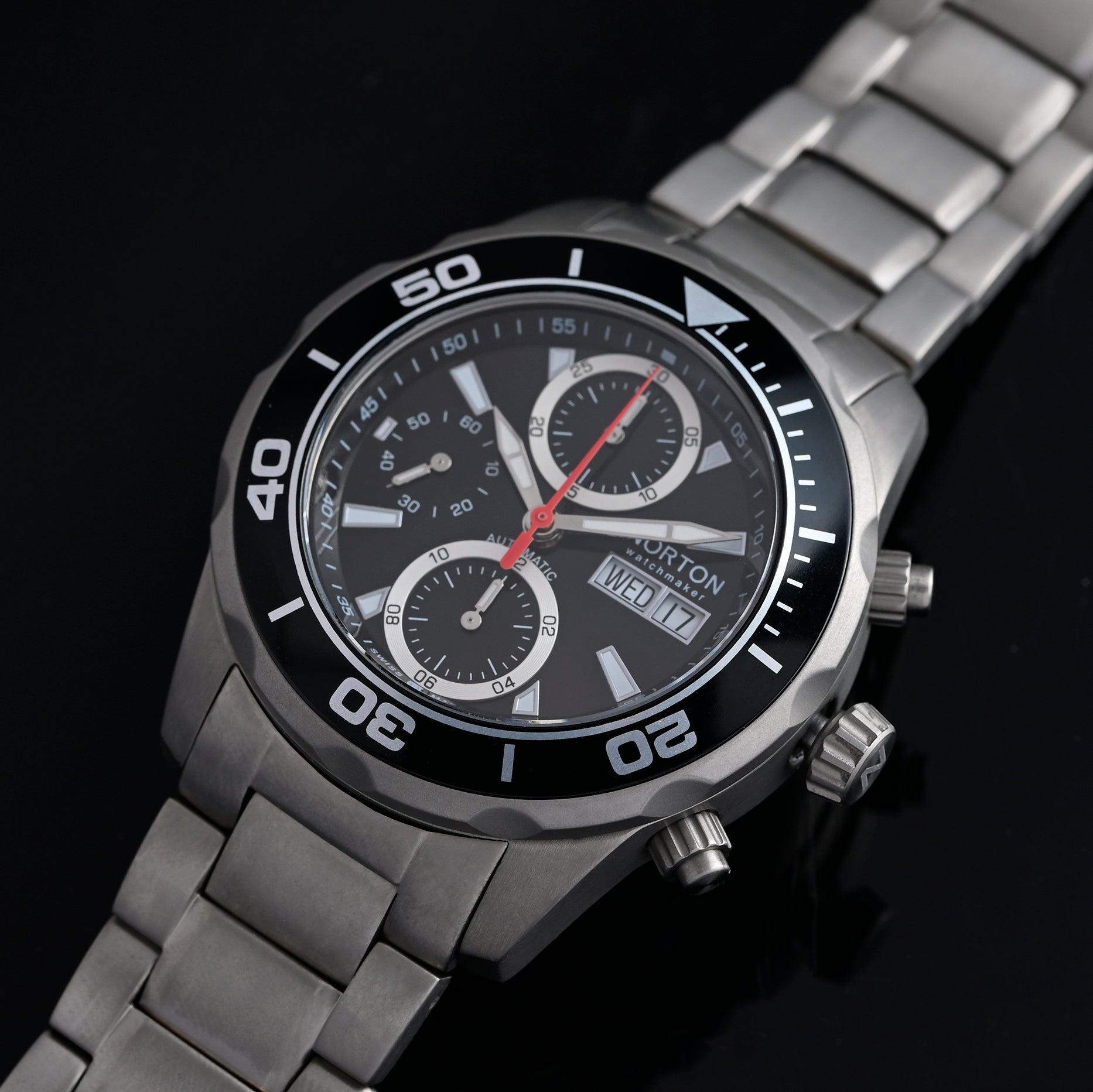 Cronografo Swiss Made con prestigioso movimento automatico ETA Valjoux 7750, icona dell’orologeria svizzera. La cassa e il bracciale in titanio offrono leggerezza, robustezza e comfort al polso, unendo sportività e raffinatezza. Un segnatempo d’eccellenza per chi cerca performance e stile senza compromessi.