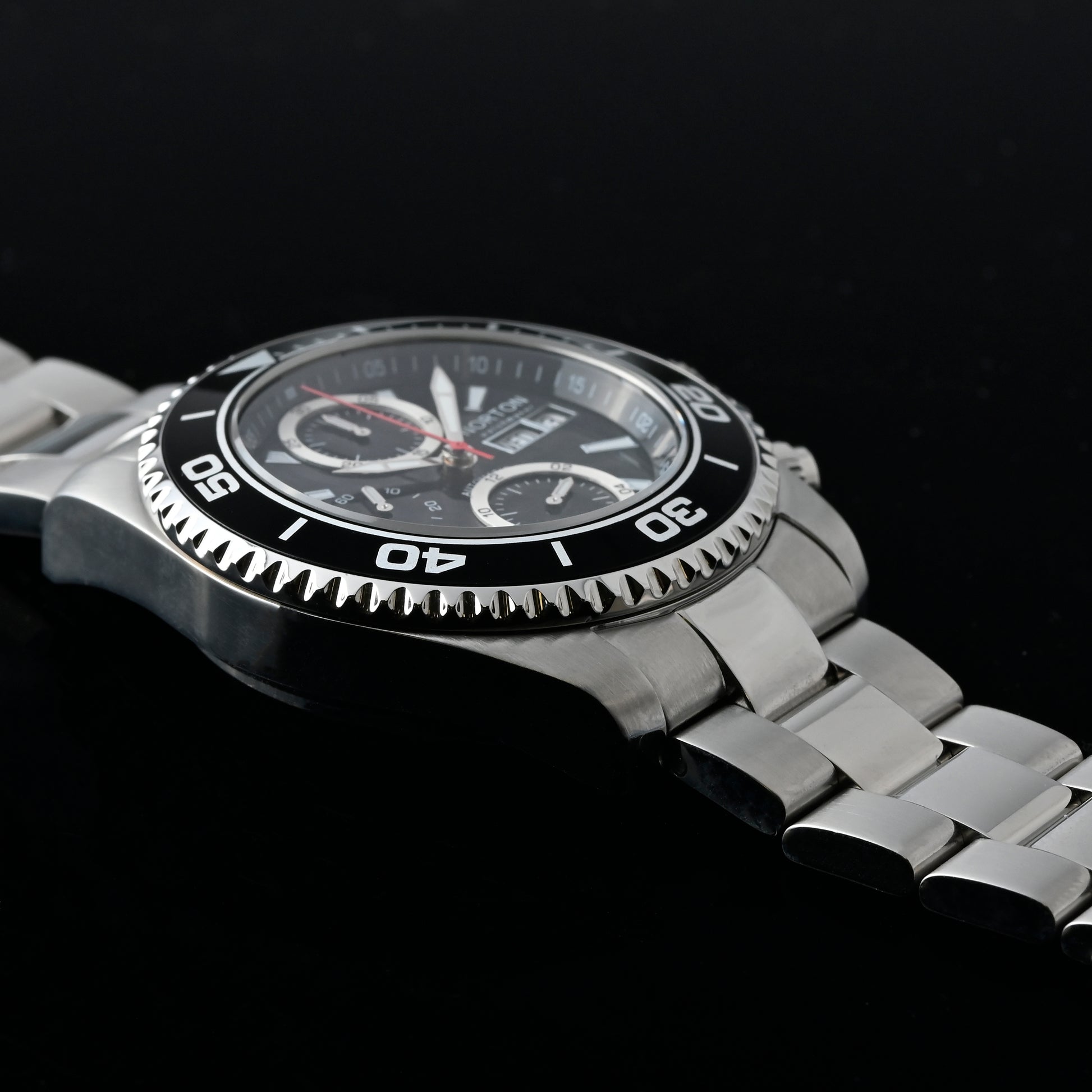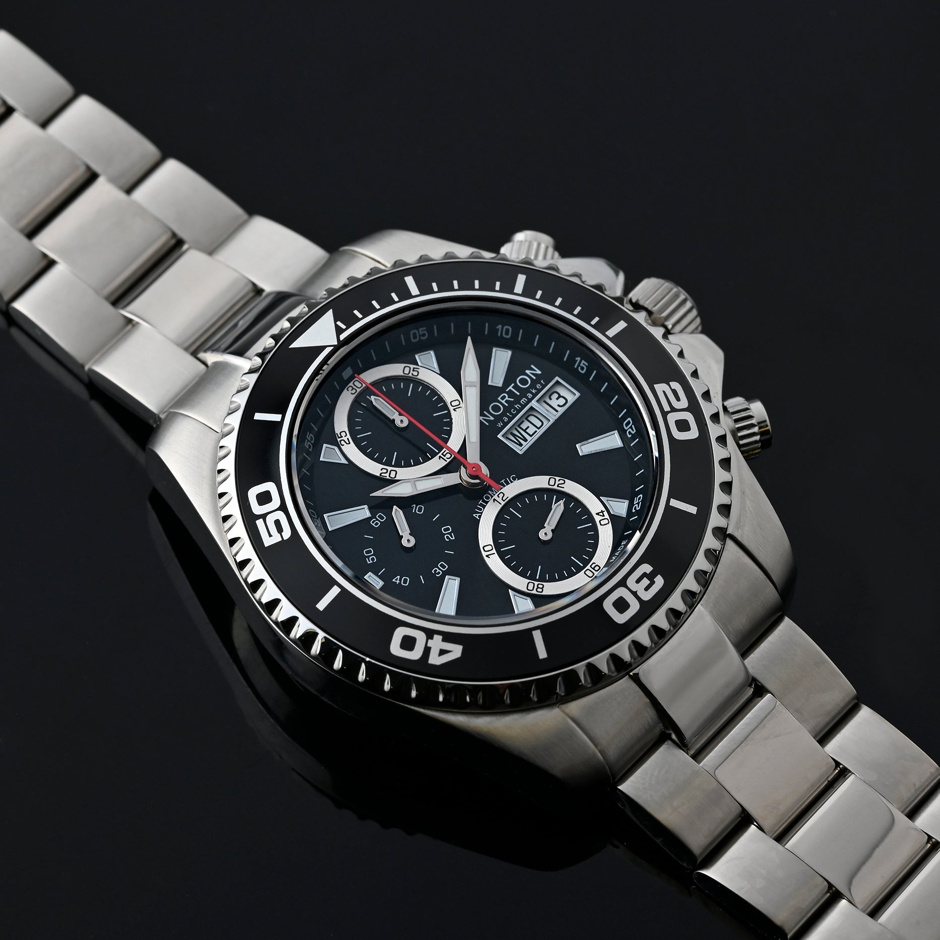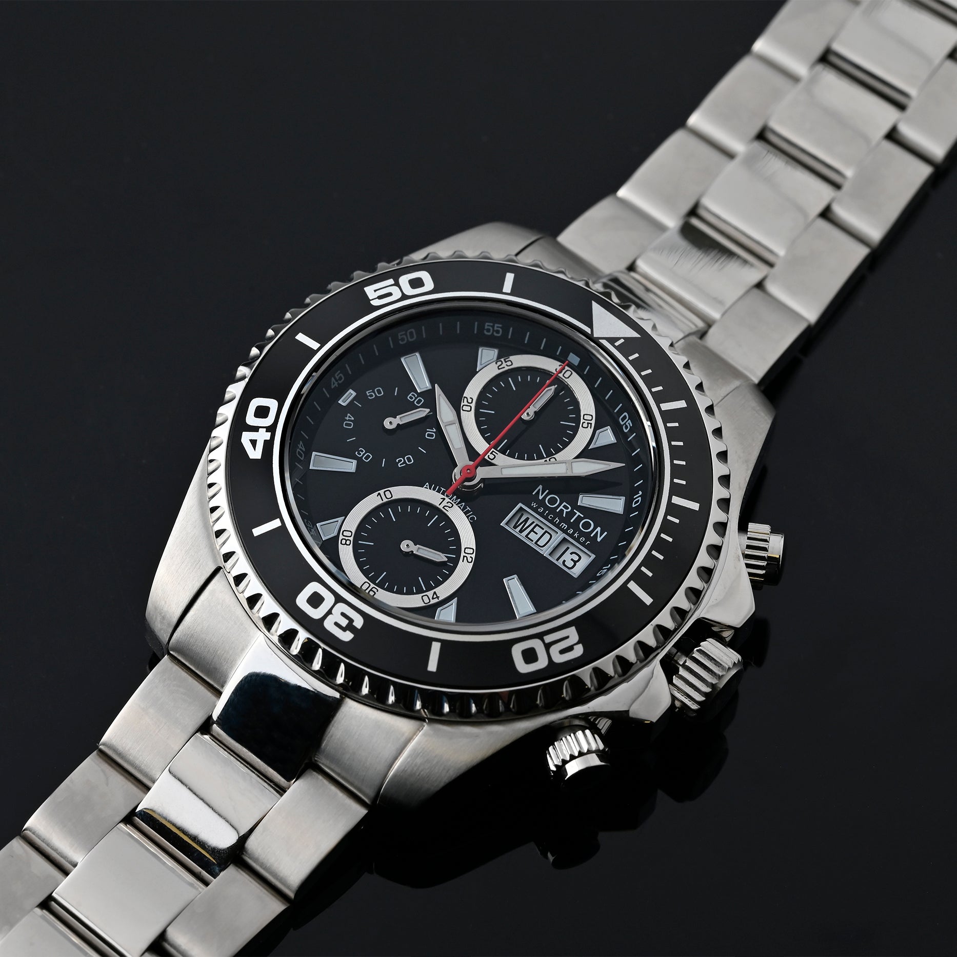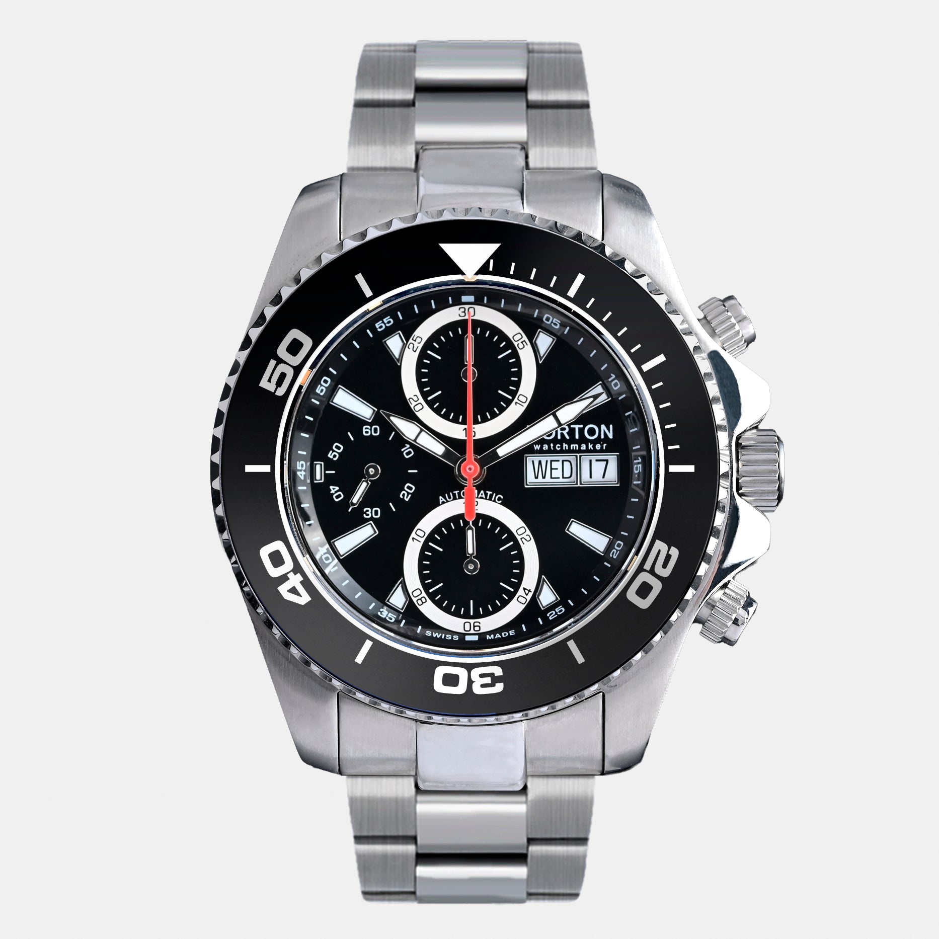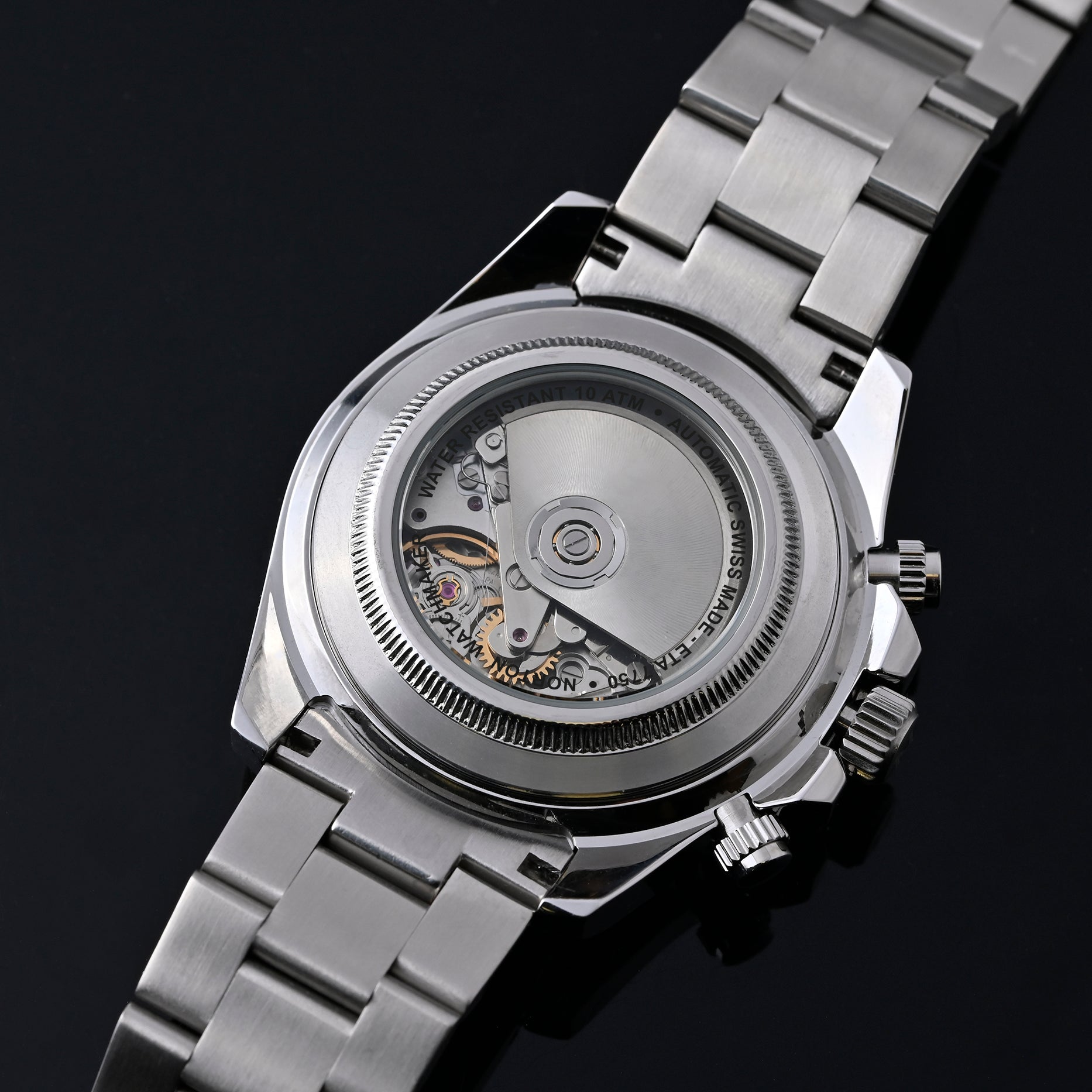 Cronografo Swiss Made con prestigioso movimento automatico ETA Valjoux 7750, icona dell’orologeria svizzera. La cassa e il bracciale in acciaio inossidabile offrono solidità, resistenza e una presenza importante al polso, unendo sportività ed eleganza. Un segnatempo d’eccellenza per chi cerca performance, affidabilità e stile senza compromessi.