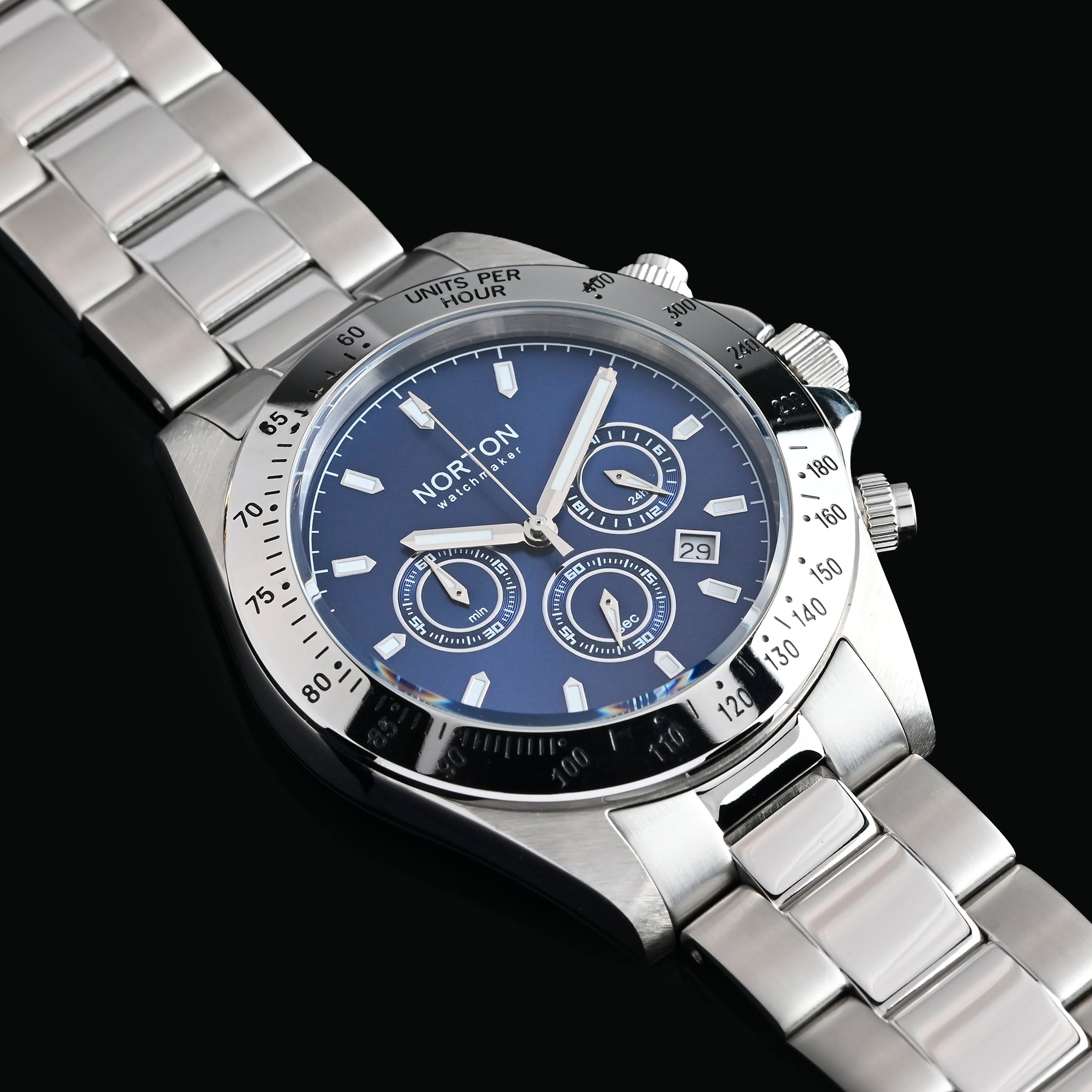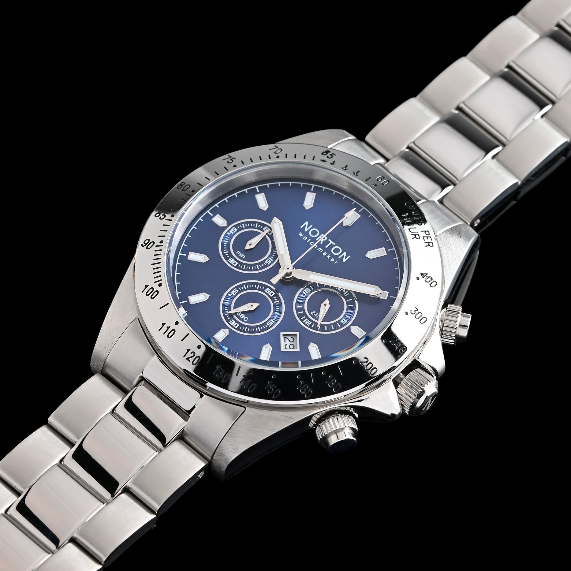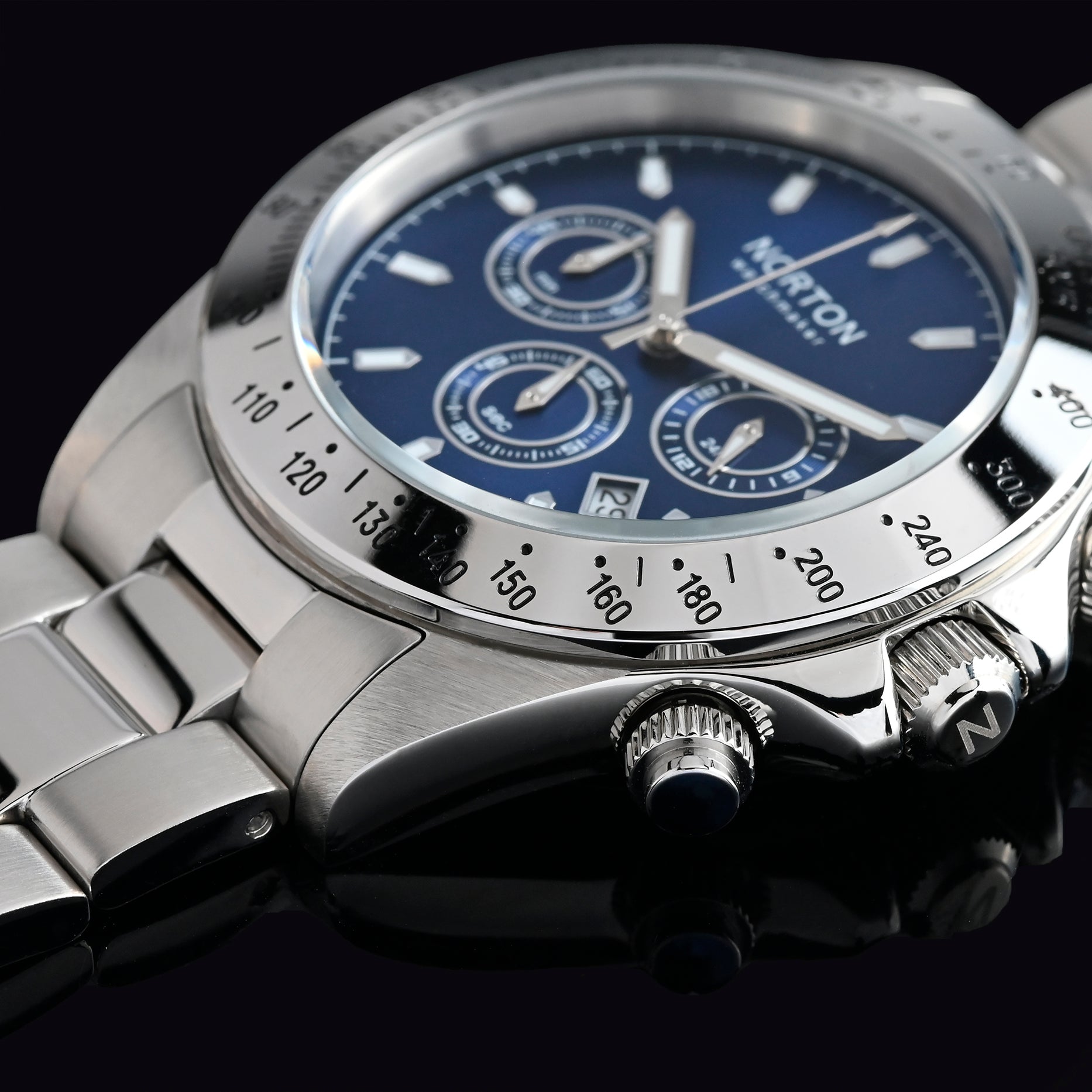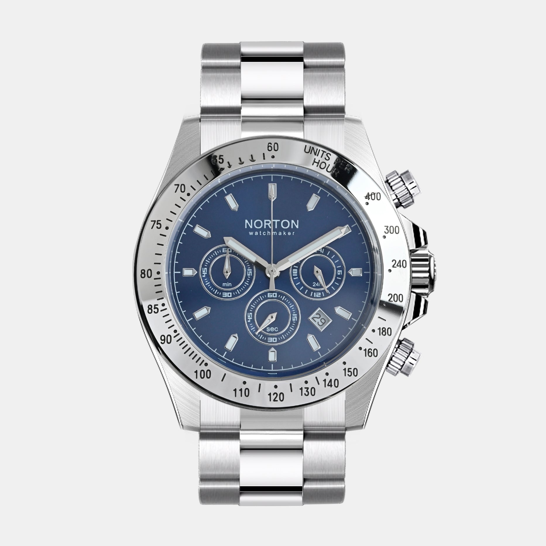Orologio cronografo al quarzo dal design solido e maschile, costruito per garantire affidabilità e resistenza. La combinazione di acciaio lucido e satinato conferisce un aspetto elegante e sportivo, ideale per ogni occasione.